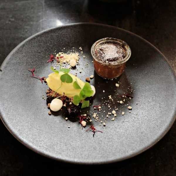 Schokoladenküchlein mit Mango-Sorbet und Passionsfrucht